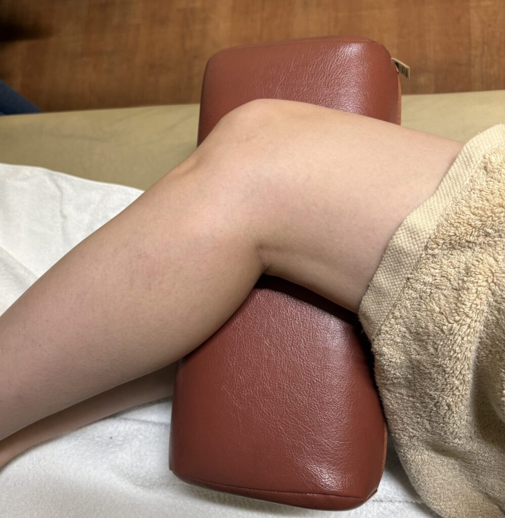 臀部の照射では効果が出にくい場合は、膝と膝の間に枕などを挟んで股を広げて光線照射します。