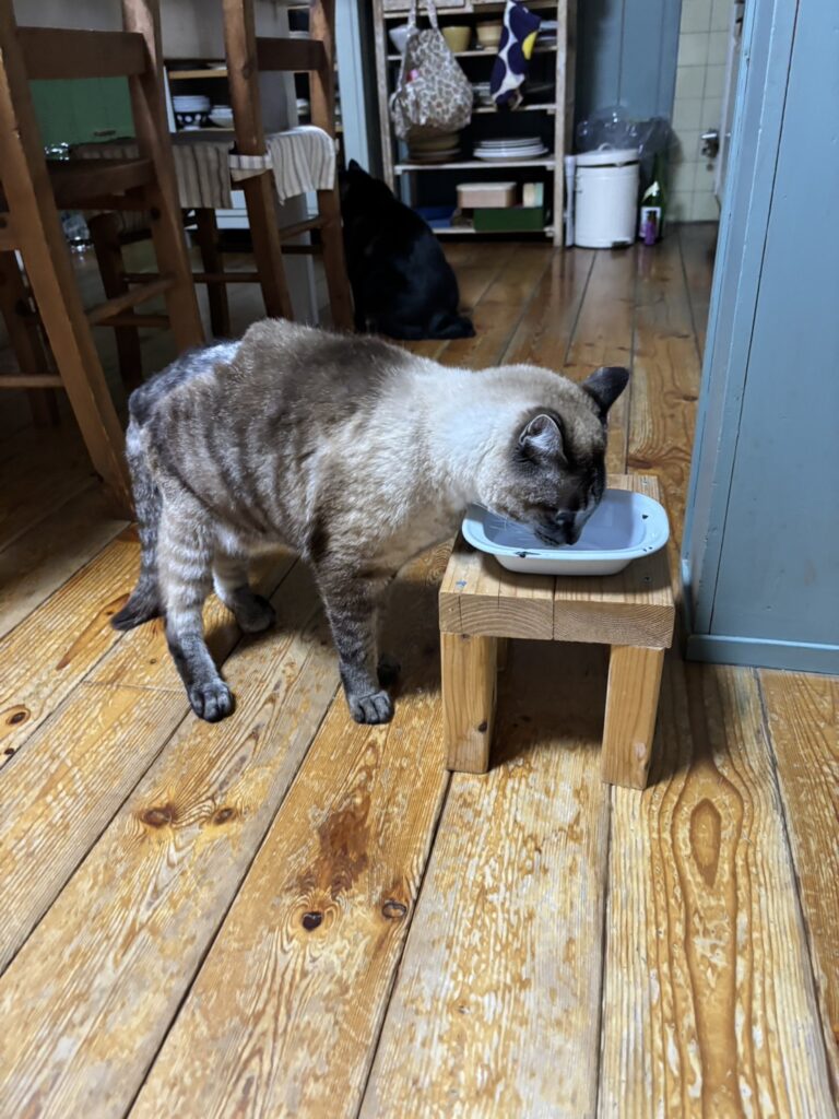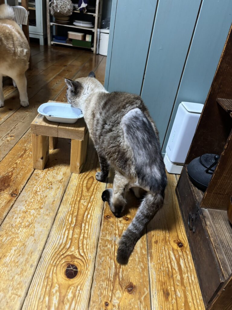 麻痺をしていた後ろ足が奇跡的に回復して、自分の足で力強く立って食事ができるようになりました。