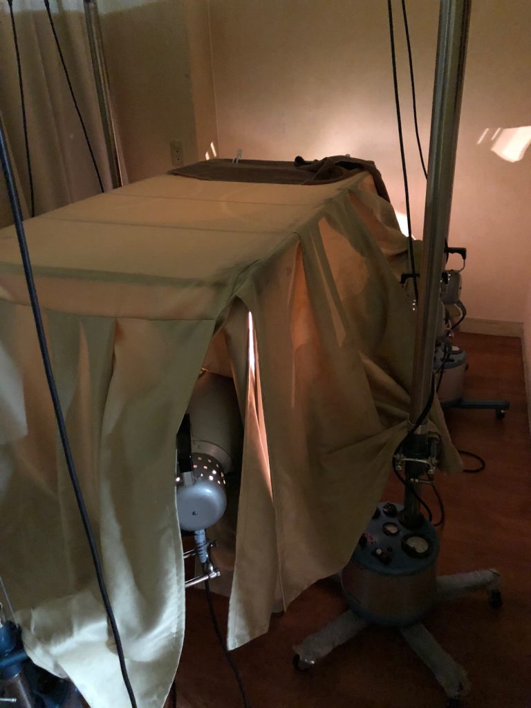 ※コウケントー光線治療を受ける時に、患者様からのご要望で臀部や胸部などのデリケートな部位に当てることもあります。そんな時のためにたんぽぽ光線は、完全シャットアウトの特殊なベッドを用意していますので、安心して光線治療が受けられます。⇩
