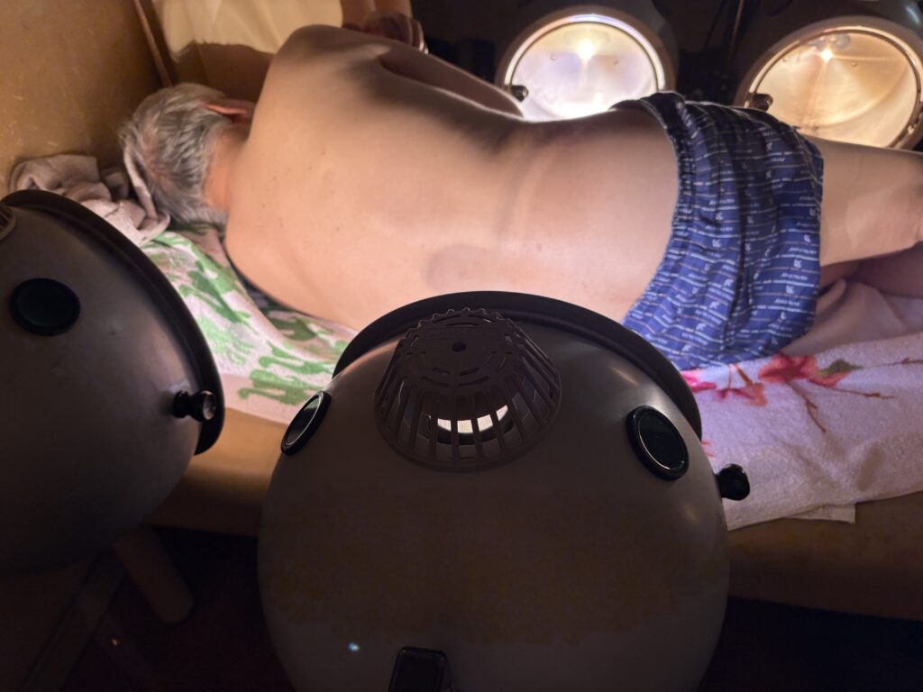 次に、頚部~背部~腰殿部にかけて光線照射をします⇩
